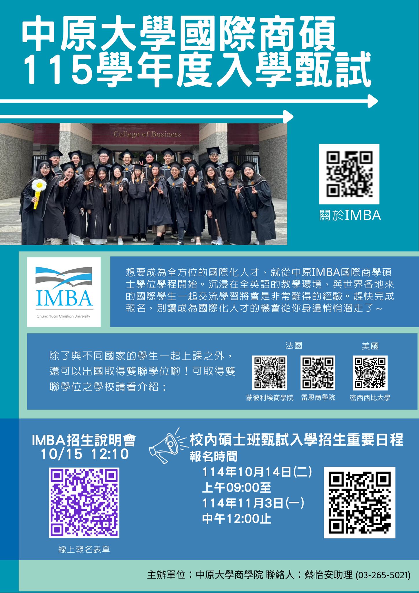The 2025 Fall Admission for the IMBA Program at CYCU will officially open on October 14!